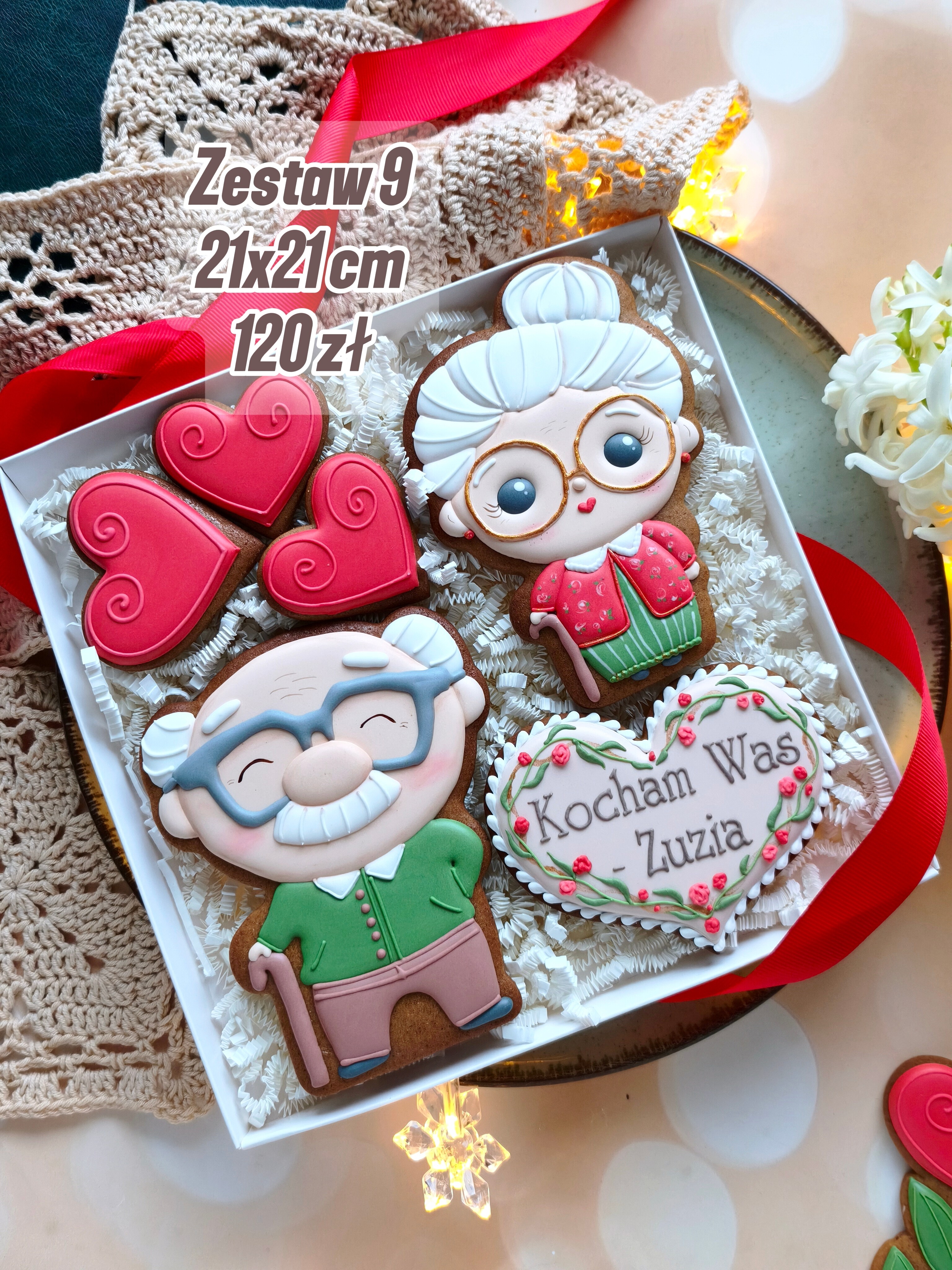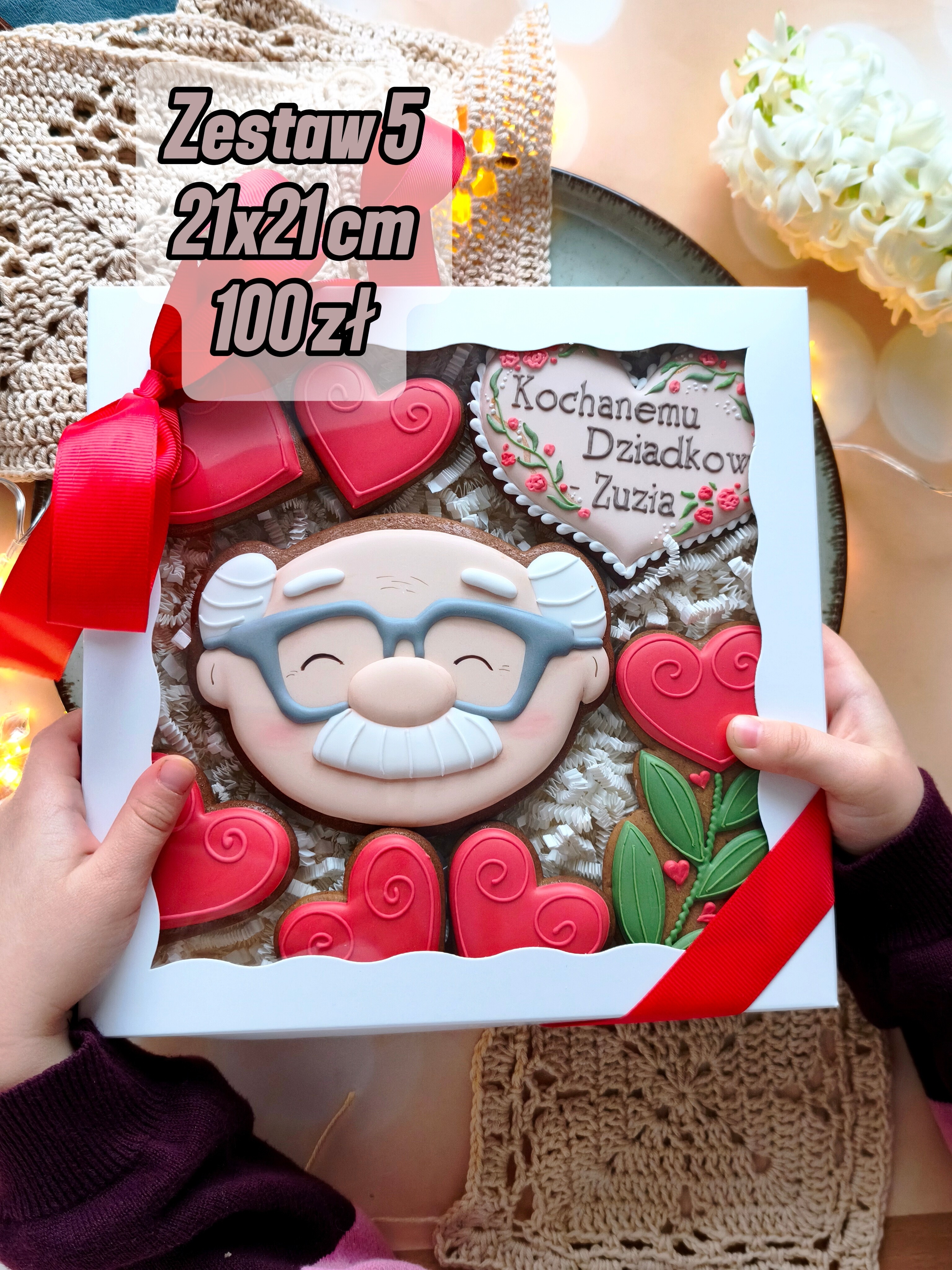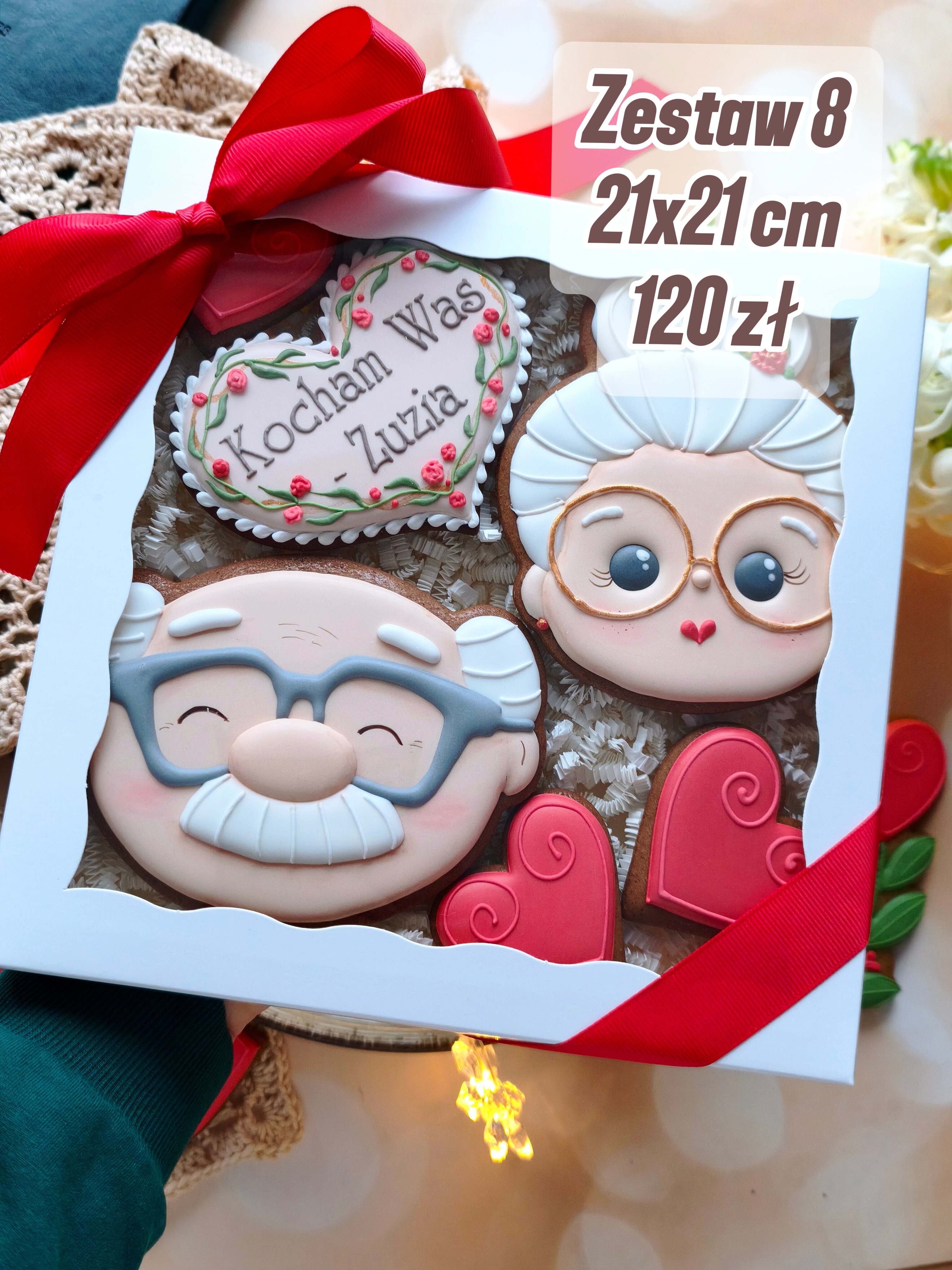 Zestawy pierników sa pakowane w pudełka 21x21 cm, jak na zdjeciach (pudełko z wieczkiem i wstążką widać na zdjeciu z zestawem nr 9), natomiast pojedyncze - w woreczek celofanowy ze wstążką.