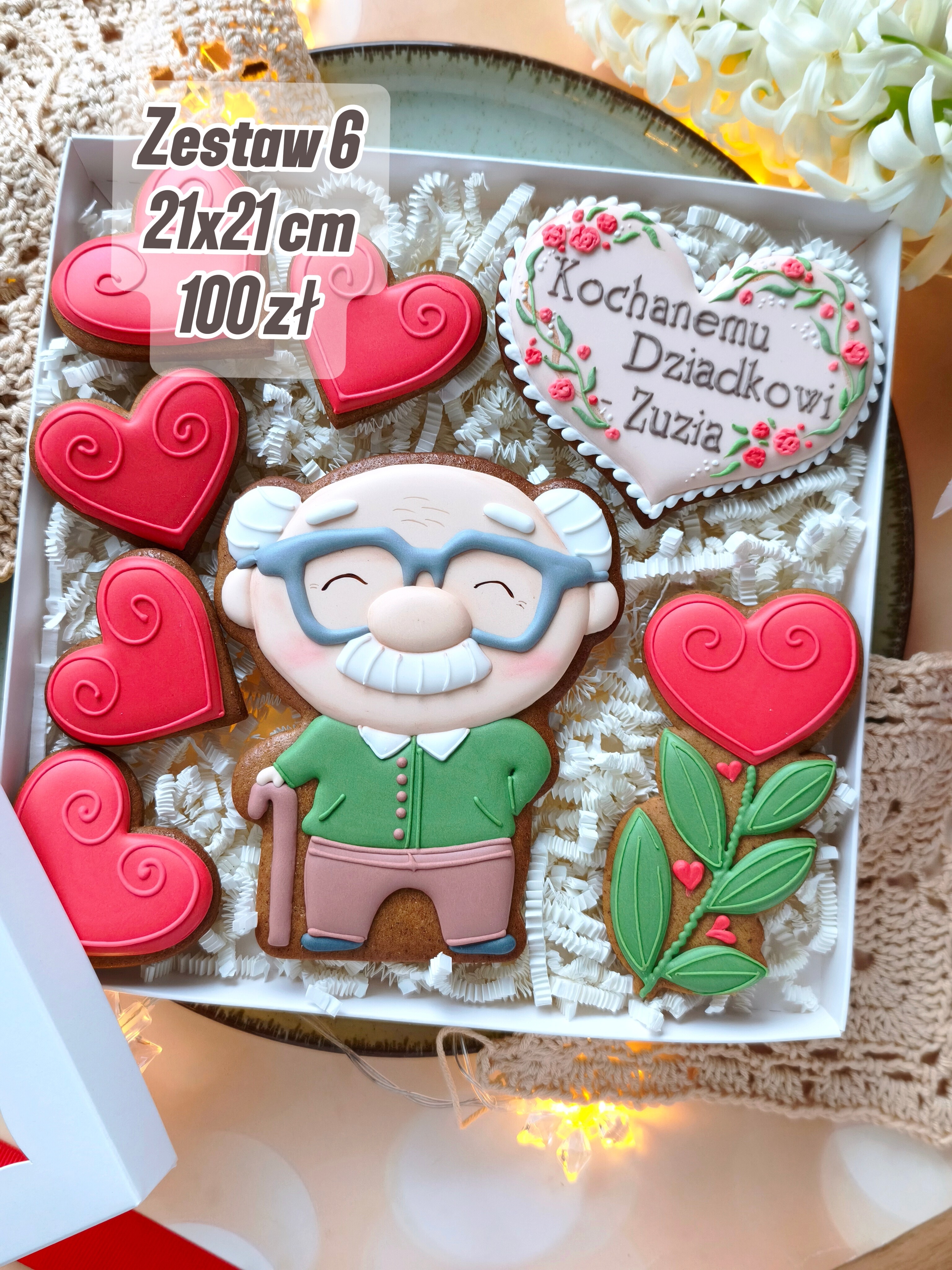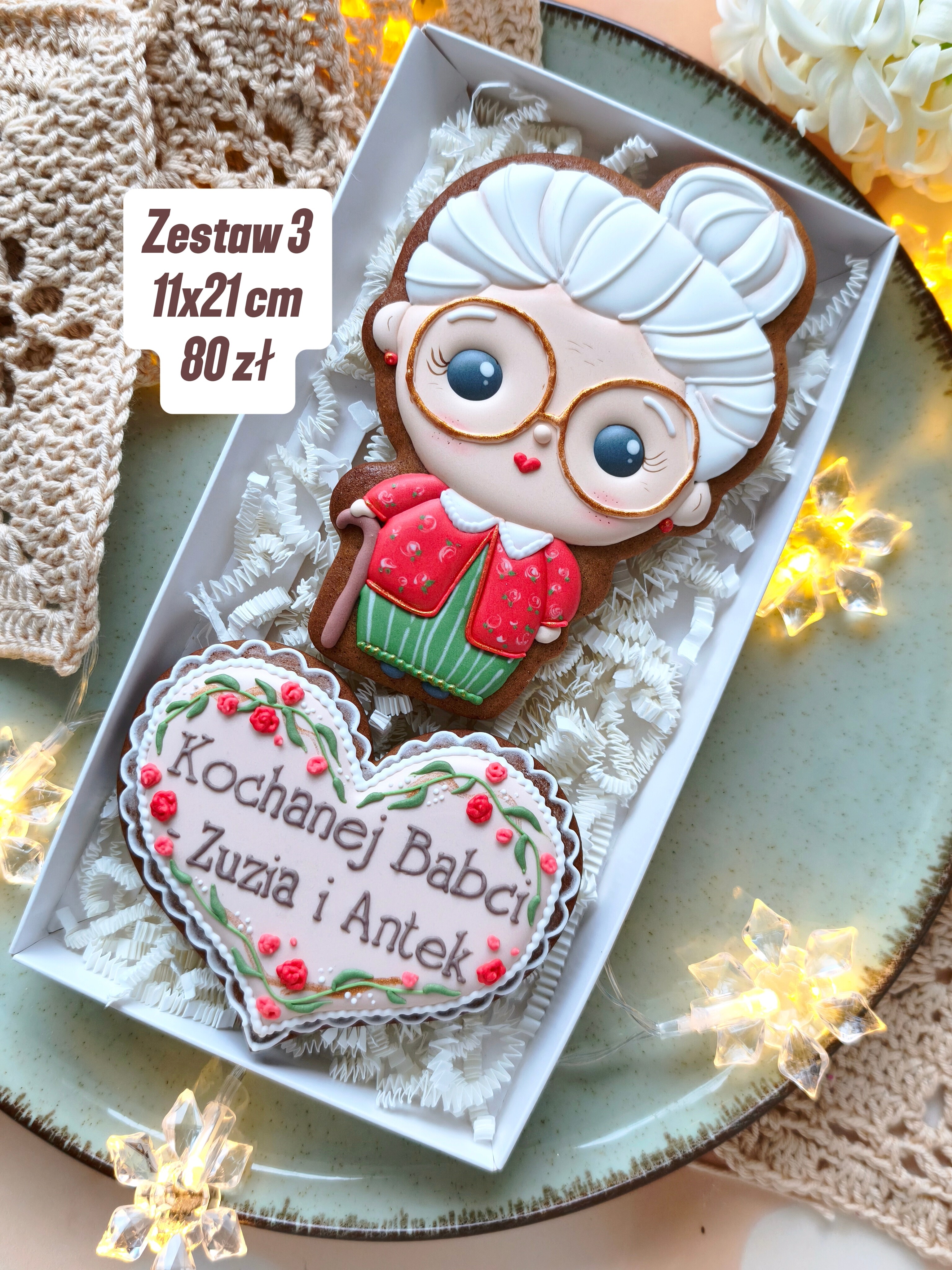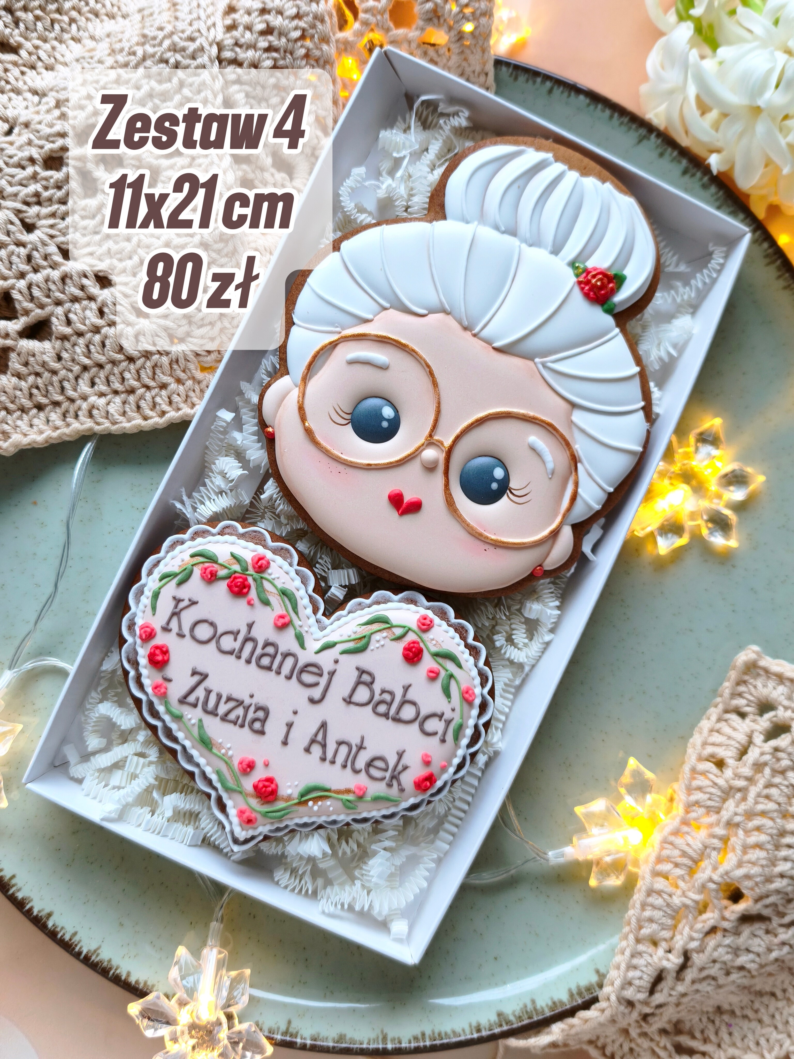 Zestawy pierników sa pakowane w pudełka 21x21 cm, jak na zdjeciach (pudełko z wieczkiem i wstążką widać na zdjeciu z zestawem nr 9), natomiast pojedyncze - w woreczek celofanowy ze wstążką.